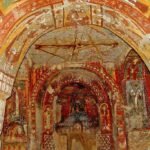 Tabii ki bu manastırların kalbi kiliseler. Kapadokya’da yüzlerce kilise var. Kimi küçücük, kimi anıtsal bazilikalar. Bazıları kayaların doğal şekline uyum sağlamış, düzensiz planlı. Bazıları ise başkent Bizans’tan esinlenmiş, tam bir sanat harikası. Mesela Karanlık Kilise… Gün ışığı neredeyse hiç girmediği için freskler hâlâ canlı. Hz. İsa’nın hayatını sahne sahne izlersiniz; doğumundan çarmıha gerilişine kadar. İnsan, “Bunu boyayan keşiş acaba burayı ibadet edenlerin nasıl göreceğini düşünerek çizdi?” diye merak ediyor.