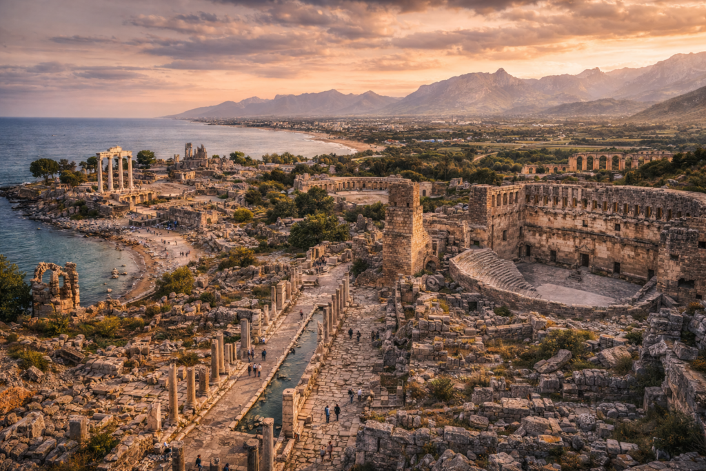 Attaleia (Antalya), Pamfilya’nın geç dönem kentlerinden biridir. Pergamon Kralı II. Attalos tarafından M.Ö. 2. yüzyılda kurulan kent, kısa sürede önemli bir liman ve ticaret merkezi hâline gelmiştir. Roma döneminde gelişimini sürdüren Attaleia, Orta Çağ boyunca da kesintisiz yerleşim görmüş nadir Pamfilya kentlerinden biridir. Günümüzde Antalya’nın tarihî çekirdeğini oluşturan Kaleiçi, antik liman ve sur sistemi bu sürekliliğin izlerini taşır.